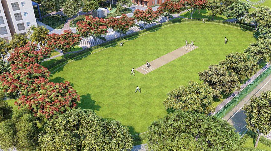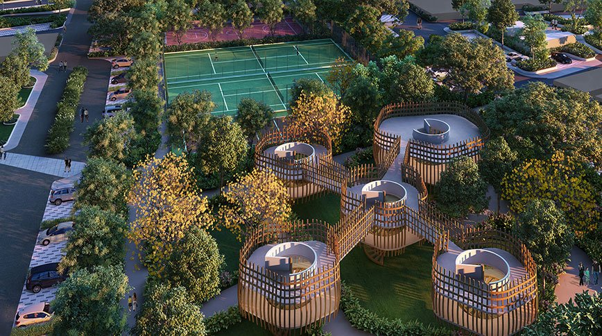 Residents can enjoy a plethora of amenities, including a tennis court, multiplex, mini-golf green, basketball court, football field, skating rink, clubhouse, mini-cricket field, multiple swimming pools, farm café, kids play area, and beautifully landscaped surroundings.